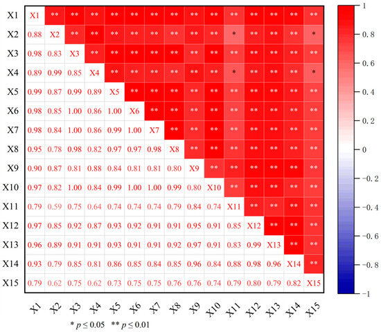 Correlation analysis between dominant components of wax and differential metabolites. X1–X15 represent 6-Hydroxykaempferol 3-Rutinoside, D-Glucaro-1,4-Lactone, 6-O-(13-Methyl-Myristoyl)-6′-O-13-Methyl-Myristoyltrehalose, Dehydroascorbate (Bicyclic Form), PI(22:6(4Z,7Z,11E,13Z,15E,19Z)-2OH(10S,17)/20:1(11Z)), PA(20:3(8Z,11Z,14Z)-2OH(5,6)/22:4(7Z,10Z,13Z,16Z)), PE(20:1(11Z)/19:1(9Z)), Linolipin A, DG(i-20:0/0:0/LTE4), 1,3-(8r,9r-Epoxy-Octadec-13z,15z-Dien-4,6-Diynoyl)-2-(Myristoyl)-Sn-Glycerol, C16 Sphinganine, C31 alkanes, C33 alkanes, C16 alcohols, and C19 fatty acids. ‘N’ stands for ‘Ningqi I’ goji leaves and ‘H’ represents ‘Huangguo’ goji leaves. Note: ‘*’ represents a significant positive correlation (p ≤ 0.05); ‘**’ represents a very significant positive correlation (p ≤ 0.01).