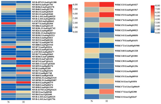 MYB transcription factor FPKM value heat map and WRKY transcription factor FPKM value heat map. ‘N’ stands for ‘Ningqi I’ goji leaves and ‘H’ represents ‘Huangguo’ goji leaves.