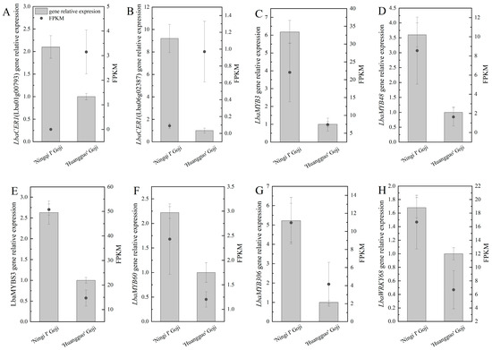 In order to verify the accuracy of the transcriptome data, we randomly selected two key DEGs (LbaCER1 (Lba06g02387, Lba01g00793)) and six TFs (LbaMYBS3, LbaMYB48, LbaMYB3, LbaMYB306, LbaMYB60, and LbaWRKY68) related to wax synthesis for real-time quantitative PCR (Figure 8A–H). The results show that, except for LbaCER1 (Lba06g02387) and LbaCER1 (Lba01g00793) (Figure 8A,B), the expression levels of the other six TFs were consistent with the transcriptome data (Figure 8C–H), which proved that the transcriptome data were reliable. The expression levels of two DEGs and six TFs in the ‘Ningqi I’ goji leaves were significantly higher than those in the ‘Huangguo’ goji leaves; these results were consistent with the trend in wax content differences in the leaf epidermis of the two species of goji, and further confirmed that these DEGs and TFs may be involved in wax synthesis for the leaf epidermis of gojis. It is worth noting that the expression level of LbaMYB3 was the highest, and was 6.2 times higher in the ‘Ningqi I’ goji leaves than in the ‘Huangguo’ goji leaves (Figure 8C). This suggests that LbaMYB3 may be one of the main transcription factors regulating wax synthesis in goji leaves.