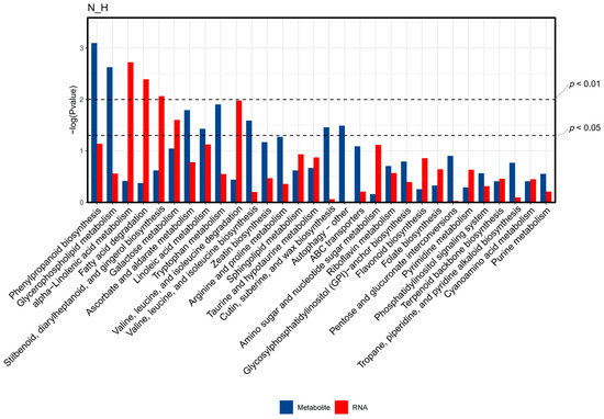2.8. Combined Metabolome and Transcriptome Analysis