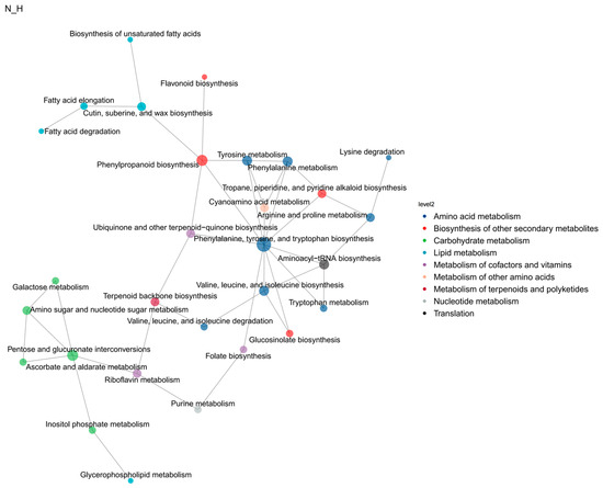 In order to understand the relationship between the differential genes of metabolomics and transcriptomics and the pathways of differential metabolites, the interaction between the two omics was studied more systematically. We used KGML to plot the links between these pathways into a network diagram, and obtained a total of nine functional network clusters (Figure 10), including amino acid metabolism, the biosynthesis of other secondary metabolites, carbohydrate metabolism, lipid metabolism, the metabolism of cofactors and vitamins, metabolism of other amino acids, the metabolism of terpenoids and polyketides, nucleotide metabolism, and translation processes. Most of the functional network groups are well connected with enzymes and metabolites involved in wax biosynthesis and its regulation.