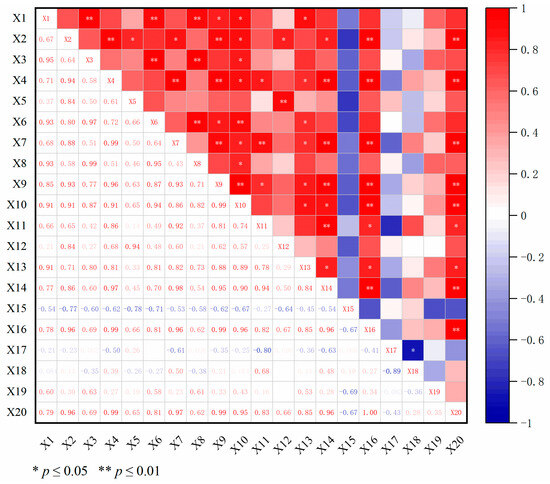Correlation heat map of wax synthesis-related genes and transcription factors with total wax content and components. X1–X20 represent LbaFATB/Lba05g02078, LbaLACS2/Lba06g03261, LbaFAR2/Lba11g02102, LbaWSD1/Lba05g01733, LbaWSD1/Lba05g01728, LbaWSD1/Lba09g00988, LbaWSD1/Lba05g01729, LbaMYB3/Lba11g00940, LbaMYBS3/Lba07g01201, LbaMYB306/Lba07g00856, LbaMYB60/Lba08g01828, LbaMYB48/Lba01g02754, LbaWRKY68/Lba06g01328, alcohols, aldehydes, alkanes, fatty acids, esters, others and total wax content. ‘*’ represents a significant positive correlation (p ≤ 0.05) and ‘**’ represents a very significant positive correlation (p ≤ 0.01).