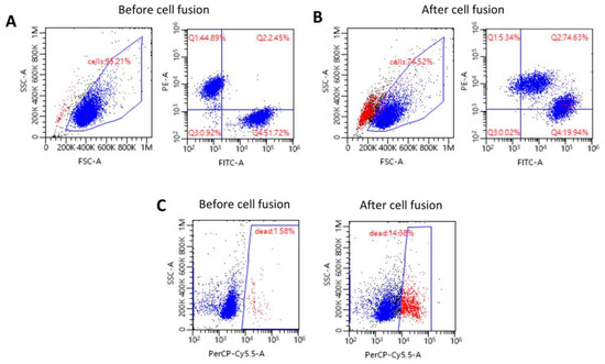 Confirmation of creation of DEC cells derived from normal, healthy donors. Representative flow cytometry dot plots confirm the cell fusion of human myoblasts stained with PKH26 or PKH67 dyes. The first row shows the following: (A) The MIX of single-stained PKH26 and PKH67 myoblast cell lines before the fusion procedure. In the SSC-A/FSC-A plot, the gate indicates the myoblast population based on the size and granularity (blue), while other objects represent the debris (red). The PE-A/FITC-A plot presents the populations of single-stained cells with PKH26 (Q1) and PKH67 (Q4) dyes. (B) Myoblasts after PEG-mediated fusion. The SSC-A/FSC-A plot presents the gating strategy to identify the cell population (gated, blue) and debris (red). The PE-A/FITC-A plot demonstrates fusion efficacy (Q2), with double-positive PKH26/PKH67 DEC cells, confirming the successful creation of human DEC cells. (C) The second row shows SSC-A/Per-Cy5.5-A plots indicating cell viability before (left image) and after (right image) PEG-mediated fusion. The gate indicates the population of dead cells visualized with 7-AAD dye (red), while the viable myoblasts are shown in blue.