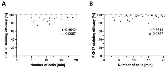 Correlation between the PKH staining efficacy and the number of myoblast cells used for staining. (A) Fair and significant correlation between the increase in the staining efficacy and the higher number of cells used for PKH26 staining (r = 0.4624). (B) Fair and significant correlation between the increase in the staining efficacy and the higher number of cells used for PKH67 staining (r = 0.3641). Each point illustrated on the graphs represents the staining efficacy value for a specific number of stained cells. Number of single cell staining with PKH26 dye, n = 36; number of single cell staining with PKH67 dye, n = 35. A nonparametric Spearman test was used to assess correlation.