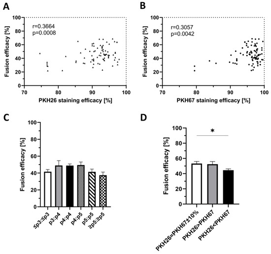 Correlation between fusion efficacy and PKH staining efficacy, number of myoblasts passages, and proportion of single-stained myoblasts in the MIX sample before fusion. (A,B) Fair and significant correlation between the increased efficacy of staining with (A) PKH26 (r = 0.3664) and (B) PKH67 (r = 0.3057) dyes and the increase in fusion efficacy. Each point illustrated on the graphs represents myoblast staining efficacy paired with the values of fusion efficacy; the analysis was obtained from an equal number of PKH26 and PKH67 myoblast stainings (n = 90) followed by 90 fusions. A parametric Pearson correlation test was used to assess the correlation. (C) No significant increase in fusion efficacy dependent on the number of passages for the myoblasts collection. A total of 87 PEG-mediated fusions were analyzed for myoblasts passages: ≤p3:≤p3 (n = 18); p3:p4 (n = 10); p4:p4 (n = 33); p4:p5 (n = 7); p5:p5 (n = 11); p≥5:p≥5 (n = 8). All data are presented as mean ± standard error of the mean (SEM). One-way ANOVA with Tukey’s multiple comparisons test was used to analyze the data. (D) A significant increase in the fusion efficacy at a 1:1 ratio of PKH26 and PKH67 single-stained myoblasts in the MIX (PKH26 = PKH67 ± 10%) when compared to the 0.75:1.0 (PKH26 < PKH67) ratio. Following numbers of fusions were evaluated for different proportions of single-stained myoblasts in the MIX (n): PKH26 = PKH67 ± 10%, n = 40; PKH26 > PKH67, n = 31; PKH67 > PKH26, n = 50. Total number of fusions, n = 121. All data presented as mean ± SEM. One-way ANOVA with Tukey’s multiple comparisons test was used to analyze the data. * p < 0.05.