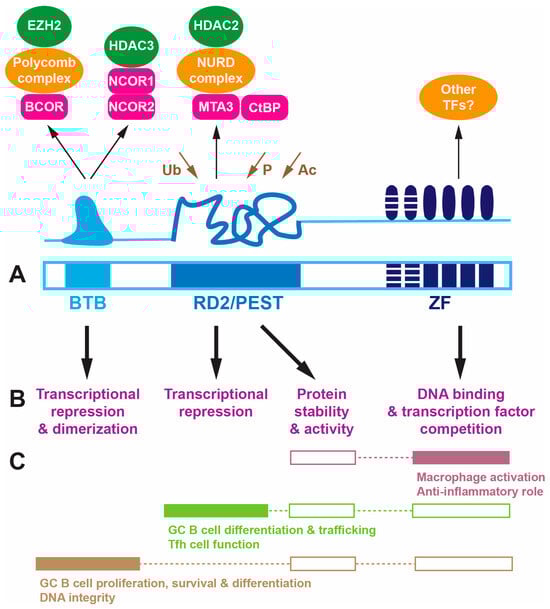 Structure and function of the BCL6 protein. (A). Domains of the BCL6 protein: BTB (light blue), RD2/PEST (blue), and ZF (dark blue, with striping for fingers not involved in DNA binding). Above is a schematic representation of the structure of each domain along with their interacting proteins, including co-repressors (pink) and associated transcriptional regulators (orange) and DNA modifying proteins (green), with sites of ubiquitination (Ub), phosphorylation (P), and acetylation (Ac) indicated (brown). (B). Major molecular function(s) of each domain. (C). Biological roles mapped to the molecular functions, with proven connections shown as filled boxes and assumed ones as unfilled boxes. Abbreviations: BTB: broad complex/tram track/bric-a-brac; RD2: repression domain 2; PEST: proline–glutamic acid–serine–threonine; ZF: zinc finger.