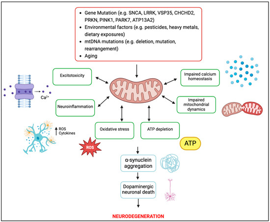 Beyond ATP synthesis, mitochondria also play a critical role in ROS regulation and Ca2+ signalling, requiring their mutual interplay for fine-tuning modulation [76]. ROS play a crucial role in both the induction of long-term potentiation (LTP) through redox modifications of target proteins and the regulation of synaptic plasticity-related signalling molecules, receptors and channels [77,78]. For example, ROS bidirectionally modulates Ca2+ handling, including cytoplasmic influx, buffering and release from intracellular stores [79]. The precise regulation of ROS production is crucial for normal neuronal function, as conditions that induce oxidative/nitrosative stress can lead to excessive Ca2+ release, potentially triggering pathological responses and neuronal cell death, which has been shown to be a significant contributor to DA neuronal loss in PD [80]. In terms of Ca2+ regulation, neuronal mitochondria are essential for maintaining intracellular Ca2+ homeostasis, either by directly buffering Ca2+ or by providing the ATP necessary for the activity of the plasma membrane Ca2+ ATPase, effectively modulating cytosolic Ca2+ responses during neuronal excitation [69,81]. As a result, mitochondria possess a remarkable capacity to influence numerous Ca2+-dependent functions within neurons [81]. In PD, DA neurons in the substantia nigra are susceptible to Ca2+-overload via essential voltage-gated L-type channels that regulate their pace making activity [82]. This in turn leads to an increase in oxidative stress, further damaging DA neurons and contributing to the progression of PD [83]. Other factors, such as increased mitophagy, increased mitochondrial DNA (mtDNA) damage and defective mitochondrial biogenesis/dynamics, further contribute to the progression of PD [75].