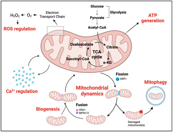 Mitochondrial function. Mitochondria are dynamic organelles crucial for energy generation, highlighted through oxidative phosphorylation. Their functionality is regulated by dynamic processes including fusion, enabling exchange of contents between mitochondria, and fission, facilitating organelle division and distribution. Mitochondrial biogenesis ensures the replenishment of these organelles, balancing turnover and maintenance. Mitophagy removes dysfunctional mitochondria, safeguarding cellular integrity. Regulation of ROS production within mitochondria is essential for redox homeostasis and physiological processes such as cell differentiation, senescence, signal transduction and adaptation to hypoxic conditions. Calcium homeostasis modulates signalling pathways and influences cellular functions. Ca2+, calcium ion; ATP, Adenosine triphosphate; DRP1, Dynamin-related Protein 1; OPA1, optic Atrophy 1; MFN1/2, Mitofusin-1/2; H2O2, hydrogen peroxide; O2, dioxygen; TCA, tricarboxylic acid; α-KG, alpha-ketoglutarate; CoA, coenzyme A.
