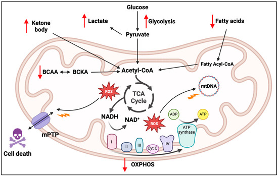 Cardiac metabolism in failing heart. In heart failure, metabolic shifts include decreased fatty acid oxidation, enhanced glycolysis, reduced glucose oxidation, increased lactate, increased ketone oxidation, decreased branched-chain amino acid oxidation and decreased oxidative phosphorylation. The abnormal substrate utilisation results in an increased production of radical oxygen species which can damage mitochondrial DNA and induce cell death by triggering the opening of the mitochondrial permeability transition pore. BCAA, branched-chain amino acids; BCKA, branched-chain keto acid; OXPHOS, oxidative phosphorylation; mPTP, mitochondrial permeability transition pore; NADH, nicotinamide adenine dinucleotide, NAD+, Nicotinamide adenine dinucleotide; CoA, coenzyme A; ATP, Adenosine triphosphate; ADP, Adenosine diphosphate; Cyt C, Cytochrome C.