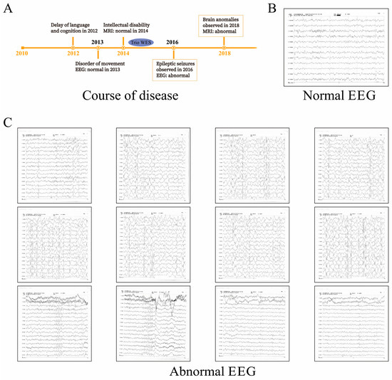 The course of the disease and clinical features. (A). Course of the disease. A schematic illustration of the clinical records of the proband from her first visit is presented here. (B). Normal EEG. The normal EGG of the girl was recorded at three years old. All * refer to separator. (C). Abnormal EEG. Abnormal EGG of the affected girl was first observed at six years old. The EEG was characterized by focal epileptic activity, burst suppression, hypsarrhythmia, or generalized spike-and-slow waves.