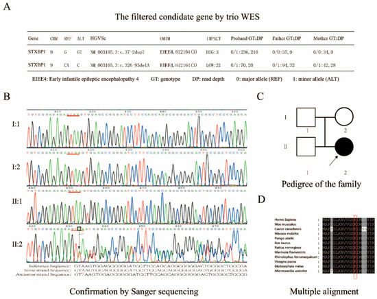 The girl first experienced developmental delays at one year and eight months, including growth retardation and movement disorder, as well as cognitive deficiency. Routine neurological examinations had been carried out alongside genetic screening (Figure S1), but the pathological basis was not revealed yet. To investigate pathogenic causality, we conducted a long-term clinical follow-up (Figure 1A). However, the affected girl did not experience epileptic spasms until she was six years old (Figure 1B,C). The observed EEG features showed high similarity to those in typical STXBP1-E. Interictal sleep EEG indicated discharges of slow spikes, and waves at 2.5 Hz followed by a hypo-voltage period. The epileptic wave pattern of a distinct burst-inhibition type was the main characteristic presented in the patient’s EEG (Figure 1C). During the period, a de novo heterozygous variation had been identified as the pathogenic mutation associated with STXBP1-E (Figure 2A). Although there were two potential pathogenic mutations detected, as a three-person family, the parents and their daughter carried the c.326-95A mutation, but only the daughter showed bad symptoms. The parents are both healthy. This is the most important piece of evidence for excluding the harmfulness of the c.326-95A mutation. The identified variant c.37+2dupT was located at the donor splice site at the junction between exon1 and intron1 of STXBP1. None of her healthy siblings and parents or the control participants carried the mutation, which was confirmed by Sanger sequencing (Figure 2B,C). The region comprising the mutation was highly conserved in the sequence between species (Figure 2D).