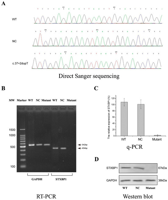 The primary cultured neuron cells were bioengineered by CRISPR/Cas9 technology. (A) Confirmation of the bioengineered cell line with c.37+2dupT homogonous mutation in STXBP1. (B) STXBP1 mRNA expression detected by RT-PCR. (C) The quantification of the STXBP1 mRNA level by q-PCR. The data were presented as mean ± standard deviation (SD). (D) The STXBP1 protein probed by Western blotting.
