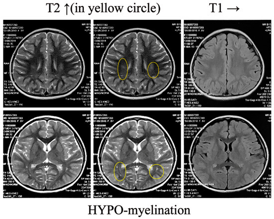 Prior to the age of six, the patient exhibited no cortical malformation on her brain MRI, as shown in Figure 1A. Unexpectedly, the girl’s brain MRI began to exhibit mild leukoaraiosis at the age of eight, as depicted in Figure 4. Diffuse white matter with hypomyelination in the parietal lobes was detected in her brain MRI, which lagged behind the late onset of seizures. The MRI confirmed the structural abnormalities in the proband, which rarely occurred in STXBP1-E. Suspicious of previous inference, we reanalyzed the trio WES data, especially focusing on the risk genes related to leukodystrophy and leukoencephalopathy, but there were no deleterious variations found. Thus, the clinical manifestation ought to be ascribed to the discerned genetic alteration in STXBP1.