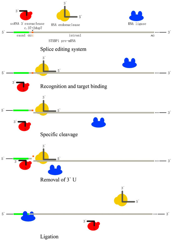 A therapeutic strategy for splice editing involves two key components: a bioengineered RNA endonuclease and exonuclease, both bearing target antisense oligonucleotides. The endonuclease targets the junction between exon 1 and intron 1, breaking the 3,5 phosphate diester bond at the 3′ terminus of the mutant GUU. Then, the RNA exonuclease removes the duplicated Uridine from the target sequence in exon 1. Endogenous RNA editing and repairing enzymes are then able to rejoin the cleaved STXBP1 pre-mRNA. This approach shows promise for therapeutically correcting splice site mutations. Therapeutic editing in pre-mRNA can share this strategy in correcting different mutations, including missense, deletion, and insertion, with dependence on relevant bioengineered RNA repairing partners. Red bubbles represent ssRNA 3′ exonuclease, yellow bubbles represent RNA endonuclease, blue bubbles represent RNA ligase, green bar represent exon1 of STXBP1 pre-mRNA and gray bar represent intron1 of STXBP1 pre-mRNA.