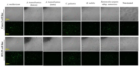 Cell death and the percent of the proliferation of Caco-2 and HT29 cell lines treated with the most promising extracts were evaluated using the automated brightfield and fluorescent image capture with a Lumascope 720 microscope (Etaluma, Carlsbad, CA, USA). Firstly, human colon adenocarcinoma cell lines were preincubated at 37 °C in 96-well plates at a density of 5 × 103 cells per well for 24 h with 5% CO2. Subsequently, cells were treated with the six extracts, namely, A. moldavicum, A. transsilvanica (leaves and root extracts), C. palustris, H. nobilis, and R. serpens subsp. nemorosus at concentration of 100 μg/mL. The Green dead cell stain SYTOX (15 nM/well) was added together with the extracts to each well and automated brightfield and fluorescent image capture was performed every 2 h at 100× on a LumascopeTM 720. The number of SYTOX positive cells, as well as the percent of proliferation, were quantified using Lumaquant 8.8 software (Etaluma, Carlsbad, CA, USA).