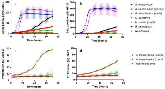 Numbers of SYTOX Green positive Caco-2 (a) and HT29 (b) cells were quantified based on fluorescent image captures using Lumaquant 8.8 software. The percent of proliferation (%) of the Caco-2 (c) and HT29 (d) cell lines was calculated based on percentage area of cells over time from brightfield image captures using Lumaquant 8.8 software. The adenocarcinoma cell lines were treated with A. moldavicum, A. transsilvanica (leaves and roots extracts), C. palustris, H. nobilis, and R. serpens subsp. nemorosus ethanolic extracts in a concentration of 100 μg/mL for 72 h. The results are expressed as mean (n = 3) +/− SD.