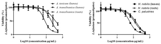 Dose-response (IC50) of A. toxicum, A. transilvanica (leaves and roots), H. nobilis (herb and roots), and C. palustries extracts against L. infantum promastigotes.
