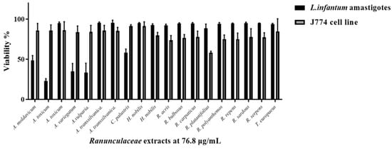 Single-point parasite rescue assay for L. infantum intracellular amastigotes. A bar graph shows antiparasitic activity of 19 Ranunculaceae ethanolic extracts at a concentration of 76.8 μg/mL against L. infantum amastigotes and cytotoxicity against J774 macrophage host cells, expressed as % cell viability +/− standard deviation.