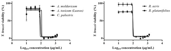Dose-response analyses (IC50) of A. moldavicum, A. toxicum (herb), C. palustries, R. acris, and R. platanifolius extracts against bloodstream form of T. brucei. Corresponding IC50s are listed in Table 2.