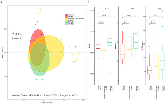 Diversity indexes for saliva samples by diagnosis group. (A) Beta diversity principal coordinates analysis (PCoA) derived from Bray–Curtis distances among saliva samples by group (cancer (PDAC), chronic pancreatitis (CP), and healthy controls (HCs)) with Bonferroni adjusted p-value for pairwise Adonis comparisons; (B) Alpha diversity indexes (Observed, Shannon, Inverse Simpson) for saliva samples by study group (cancer (PDAC), chronic pancreatitis (CP), and healthy controls (HCs)).