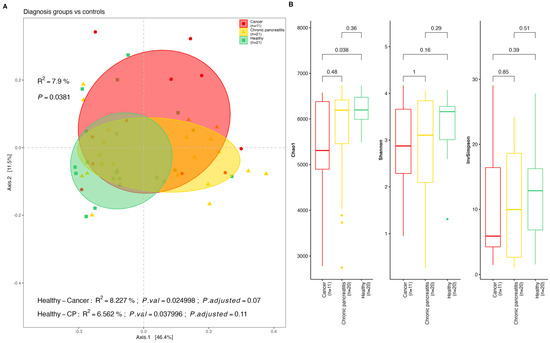Diversity indexes for stool samples by diagnosis group. (A) Beta diversity principal coordinates analysis (PCoA) derived from Bray–Curtis distances among stool samples by group (cancer (PDAC), chronic pancreatitis (CP), and healthy controls (HCs)) with Bonferroni adjusted p-value for pairwise Adonis comparisons; (B) Alpha diversity indexes (Observed, Shannon, Inverse Simpson) for stool samples by study group (cancer (PDAC), chronic pancreatitis (CP), and healthy controls (HCs)).