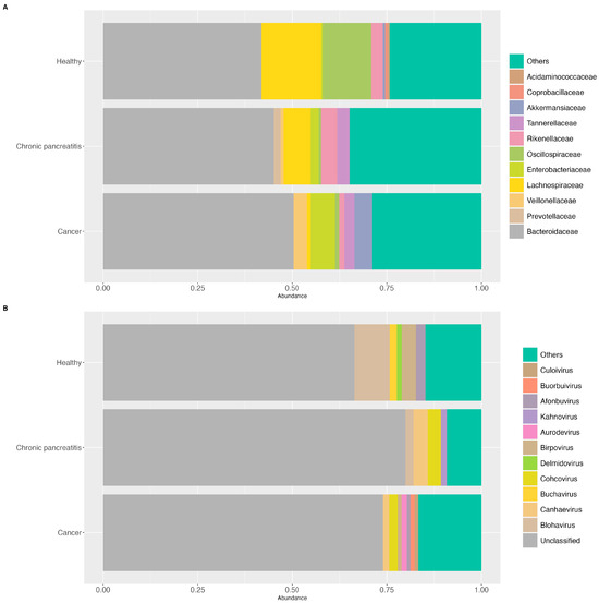 A graph of the 20% most prevalent bacterial and viral taxa in the stool samples among the groups. (A) A graph of the 20% most prevalent bacterial taxa in the stool samples agglomerated at the family level, according to the diagnosis group (cancer (PDAC), chronic pancreatitis (CP), and healthy controls (HCs)); (B) a graph of the 20% most prevalent viral taxa in the stool samples agglomerated at the genus level, according to the diagnosis group (cancer (PDAC), chronic pancreatitis (CP), and healthy controls (HCs)).