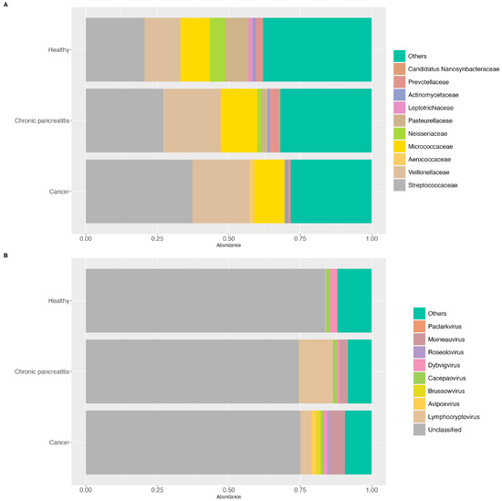 A graph of the 20% most prevalent bacterial and viral taxa in the saliva samples among the groups. (A) A graph of the 20% most prevalent bacterial taxa in the saliva samples agglomerated at the family level, according to the diagnosis group (cancer (PDAC), chronic pancreatitis (CP), and healthy controls (HCs)); (B) a graph of the 20% most prevalent viral taxa in the saliva samples agglomerated at the genus level, according to the diagnosis group (cancer (PDAC), chronic pancreatitis (CP), and healthy controls (HCs)).