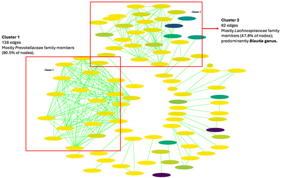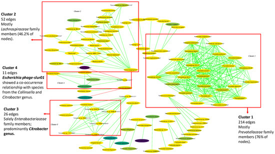 Interaction analyses were performed for each health status group in terms of the subjects. We observed the same two main clusters in the interaction analyses for the stool samples from both the HCs and CP patients (Figure 5 and Figure 6, Tables S4 and S6). These two clusters were comprised only of co-occurrence relationships, which we can interpret as two mutual clusters. The biggest cluster (Cluster 1) (138 and 214 edges for HCs and CP patients, respectively) was mostly comprised of species from the Prevotellaceae family (90.5% and 76% of the nodes, respectively). The second cluster (Cl. 2) (62 and 52 edges, respectively) was mostly comprised of species from the Lachnospiraceae family (47.8% and 46.15% of the nodes, respectively). The main difference was in the second cluster, where for the HCs, the Blautia genus was the most predominant among the Lachnospiraceae family, while in the CP network, the genera Coprococcus, Wujia, Butyrivibrio, and Novisyntrophococcus were the most abundant. In the CP network, a cluster with 26 edges was present (Cl. 3). This cluster was formed solely of species from the Enterobacteriaceae family, particularly the Citrobacter genus (100% of the nodes). Another small cluster was formed (11 edges) (Cl. 4), where Escherichia phage-slur01 showed a negative correlation with the uncultured CrAssphage (p-value < 0.05), indicating the mutual exclusion of these two taxa (Table S7). At the same time, in this cluster, Escherichia phage-slur01 showed a co-occurrence relationship with species from the Collinsella and Citrobacter genus (p-value < 0.05 in all cases) (Table S7). The observed differences in the interaction clusters in the HC and CP networks were present in smaller clusters (<=5 edges). Among them, we observed the same connection involving virus taxa, like the positive interaction between CrAssphage cr115-1 and CrAssphage cr53-1 (p-value < 0.05), indicating a pattern of co-occurrence between the taxa (Tables S5 and S7). CrAssphage cr-53-1 was the most abundant viral species (0.13% of relative abundance) among the HCs.