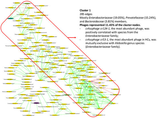 Regarding the interaction analysis of PDAC stool samples, we observed a strikingly different pattern compared to the other two stool sample groups (Figure 7). The results showed a single predominant cluster (Cl. 1) (285 edges) that mostly integrated species from the Enterobacteriaceae (19.05% of the nodes), Prevotellaceae (15.24%), and Bacteroidaceae (3.81%) families (Table S8). Escherichia coli and Bacteroides faecis were the most abundant species present in the cluster (5.44%, 2.49% of the relative abundance, respectively). Interestingly, a mutual exclusion relationship was observed between the Bacteroides faecis and Escherichia genus species (p-value < 0.05 in all cases) (Table S9). In contrast to the other groups, the phages had a significant role in the interaction network in the PDAC samples. Phages represented 11.43% of the cluster nodes, including crAssphage cr124-1, the most abundant viral species (0.07% relative abundance) (Table S8). This phage showed a mutual exclusion relationship with crAssphage cr53-1 (p-value < 0.05), the most abundant phage in HC samples (Table S9). Moreover, crAssphage cr53-1 was mutually exclusive with the Klebsiella genus species (Enterobacteriaceae family) (p-value < 0.05 in all cases), which was only found in the PDAC network. The most abundant phage, crAssphage cr124-1, showed mutual exclusion with CrAssphages cr1-1, cr114-1, cr85-1, cr110-1, and cr6-1, but co-occurrence occurred with CrAssphage cr11-1 and crAssphage 7-1 (p-value < 0.05 in all cases). Finally, crAssphage cr124-1 and the co-occurrence phages were positively correlated with species from the Enterobacteriaceae family, Raoultella planticola, and Enterobacter cloacae (p-value < 0.05) (Table S9).