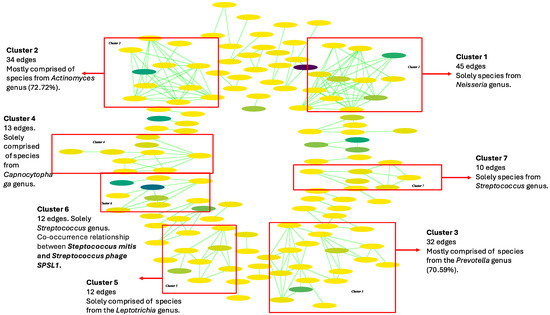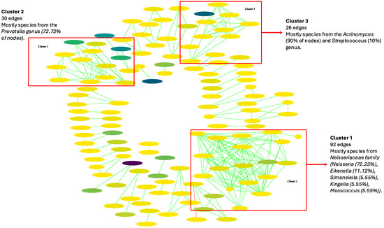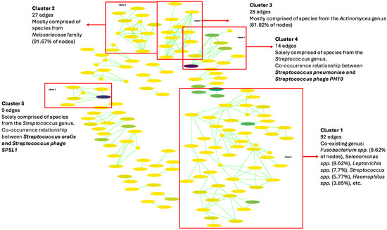 A major change in the pattern in the interaction network of the PDAC group was observed (Figure 10). One big cluster (Cl. 1) with 92 edges was observed as a combination of different coexisting genera, such as Fusobacterium spp. (9.62% of the nodes), Selenomonas spp. (9.62%), Leptotrichia spp. (7.7%), Streptococcus spp. (5.77%), and Haemophilus spp. (3.85%), among others (S14 Table). Moreover, genera, such as Campylobacter, Anaerococcus, and Parvimonas, were present in this cluster, while they were not represented in the HC network. An interesting interaction in terms of this cluster was the co-occurrence relationship between Fusobacterium nucleatum and Campylobacter showae (p-value = 1.01 × 10−4) (Table S15). In addition, a cluster with 27 edges, mostly comprised of species from the Neisseriaceae family (91.67% of the nodes) (Cl. 2), and a cluster with 28 edges, mainly consisting of species from the Actinomyces genus (81.82%) (Cl. 3), was observed, as in the other groups. However, the cluster made predominantly of the Prevotella genus was no longer present (Figure 10, Table S14). Streptococcaceae family members were observed in different minor clusters across the network (Table S14). In one of these clusters (13 edges) (Cl. 4), a co-occurrence relationship between Streptococcus pneumoniae and Streptococcus phage PH10 was observed (p-value = 0.0018). Similarly, in another Streptococcaceae cluster with nine edges (Cl. 5), Streptococcus oralis showed a coexistence relationship with Streptococcus phage SPSL1 (p-value = 0.0016) (Table S15). The rest of the interactions between the taxa were distributed in small groups with </= 6 edges.