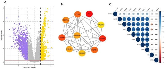 A total of 1539 differentially expressed genes (DEGs) were identified between the bladder and normal samples. Of these, 519 genes were upregulated, while 1020 genes were downregulated. Genes with an adjusted p-value < 0.05 and a log2-fold change >2 were considered significant. The volcano plot and clustering module of these DEGs are illustrated in Figure 1. To explore the functions and pathways associated with these DEGs, enrichment analysis was performed, which highlighted the roles of these key genes. We examined the topological properties using the Network Analyzer and CytoHubba plugins in Cytoscape. Hubs within the network, characterized by their high degree, are pivotal to the PPI network’s function (Figure 1B). Genes frequently appearing in the top 10 by degree, namely IL6, CCNA2, CCNB1, CDK1, PLK1, TOP2A, AURKA, AURKB, FOXM1, and CALML5, were identified as potential biomarkers. Of these, nine genes were upregulated, with AURKB showing the highest fold change of 3.56, followed by TOP2A with 3.30. Other upregulated genes include CDK1, FOXM1, PLK1, AURKA, CCNA2, CCNB1, and CALML5, with fold changes of 3.27, 3.04, 2.91, 2.74, 2.74, 2.57, and 2.88, respectively. In contrast, IL6 was downregulated, with a fold change of −4.39. The expression levels of these genes were notably higher in bladder cancer patients compared to normal samples. Correlation analyses were conducted to assess the expression relationships among the hub genes. The results revealed a high positive correlation among most of the hub genes, with the exception of IL6, AURKA, and CALML5 (Figure 1C).