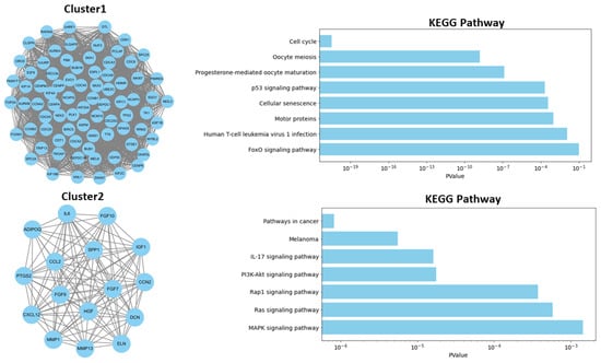 To further investigate the associations within the PPI network, the top two modules were extracted using the “MCODE” package in Cytoscape. Cluster 1, which had the highest cluster score, comprised 75 nodes and 2661 edges (Figure 2). In contrast, Cluster 2 consisted of 16 nodes and 111 edges (Figure 2). To elucidate the biological functions of these clusters, we performed functional annotation analysis using the DAVID database for each module separately. The most significantly enriched biological processes and KEGG pathways are summarized in Figure 2. Genes in Cluster 1 were predominantly associated with the cell cycle, oocyte meiosis, progesterone-mediated oocyte maturation, the p53 signaling pathway, and cellular senescence, whereas genes in Cluster 2 were linked to the IL-17 signaling pathway, the PI3K-Akt signaling pathway, the Rap1 signaling pathway, and the Ras signaling pathway.