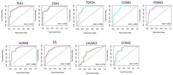 Receiver operating characteristic (ROC) curve analyses further demonstrated the diagnostic and prognostic value of these key genes. The ROC analysis highlighted that the mRNA expression levels of PLK1, CDK1, TOP2A, AURKA, AURKB, CCNB1, FOXM1, and CCNA2 effectively differentiated bladder cancer from normal tissues (Figure 3). Specifically, CDK1, with an AUC value of 0.93, followed by PLK1 at 0.91 and AURKB at 0.90, showed the largest areas under the ROC curve, indicating their strong potential for distinguishing between bladder cancer and normal samples (Figure 3). Therefore, after combining the above analysis of the nine hub gene expression levels with the ROC results, we concluded that these genes might be the most potential genes with higher diagnostic values. Except for IL6, expressions of other genes were significantly higher in bladder cancer than in the normal sample (Figure 4).