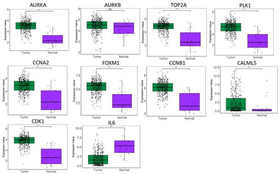 The box plots display the expression levels of several of the ten hub genes that exhibit statistically significant differential expression between normal and bladder cancer samples (** p < 0.01; *** p < 0.001; NS: Not Significant).