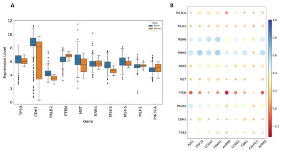 The disease-associated genes linked to bladder cancer were identified using the GeneCards database (https://www.genecards.org/, accessed on 10 July 2024). GeneCards uses a scoring system to evaluate gene–disease associations, where higher scores indicate stronger evidence of relevance to the specific disease. This analysis revealed notable differences in gene expression levels between control and bladder cancer groups, with significant genes including TP53, MET, PTEN, PIK3CA, CDH1, PALB2, KRAS, MSH2, MSH6, and MLH1 (Figure 7A). Pearson correlation analysis showed that the expression of these disease-related genes was strongly positively correlated with several hub genes. Specifically, high levels of CCNA2, CCNB1, CDK1, PLK1, TOP2A, AURKA, AURKB, FOXM1, and CALML5 were positively associated with TP53, MET, PIK3CA, CDH1, PALB2, KRAS, MSH2, MSH6, and MLH1. Notably, MSH2 and MSH6 demonstrated a high correlation with these genes (Figure 7B).