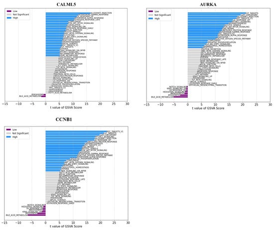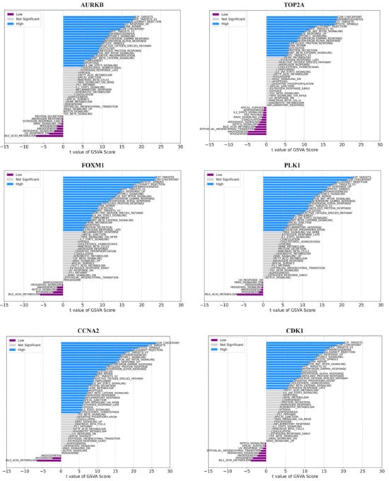 The GSVA methodology transforms expression data into gene set enrichment scores, enabling the evaluation of pathway activity across samples. This allows us to assess how active these pathways are across different samples. We proceeded to analyze the specific signaling pathways involved in the ten hub genes and explored the effect of candidate genes on the signaling pathways related to disease progression. GSVA results showed that high expression of the hub genes primarily enriched E2F targets, PI3-AKT-Motr signaling, mitotic spindle, apoptosis, Wnt/beta-catenin, Apical Junction, and other signaling pathways (Figure 8). Low expression of AURKB, FOXM1, and PLK1 genes mainly enriched angiogenesis, bile acid metabolism, and myogenesis pathways, whereas low expression of TOP2A enriched in angiogenesis, bile acid metabolism, Notch signaling, coagulation, p53, apical surface, and kras signaling_up pathways (Figure 8).