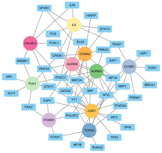 For the hub genes we identified, a TF–gene regulatory network was constructed. This network includes 86 interaction pairs among the selected genes and 38 TFs (Figure 9). CDK1 was found to be regulated by 14 TFs, AURKA by 12 TFs, CCNA2 by 11 TFs, AURKB and TOP2A by 8 TFs, PLK1 and IL6 by 7 TFs, CALML5 by 6 TFs, and FOXM1 by 5 TFs. In addition, most of the TFs were found to regulate more than one hub gene. For example, FOXC1 was identified to connect with CDK1, CCNA2, PLK1, CALML5, AURKA, and IL6. CREB1, GATA2, NFYA, and SRF were found to be regulated by four hub genes. Out of 38 TFs, only 12, namely, E2F1, EGR1, FOS, HINFP, HNF4A, IRF2, KLF4, RUNX2, SPIB, SRY, and USF1, were found to interact with only a single hub gene. These findings indicate that the hub genes might be regulated by these transcription factors and are likely involved in biological processes related to bladder cancer.