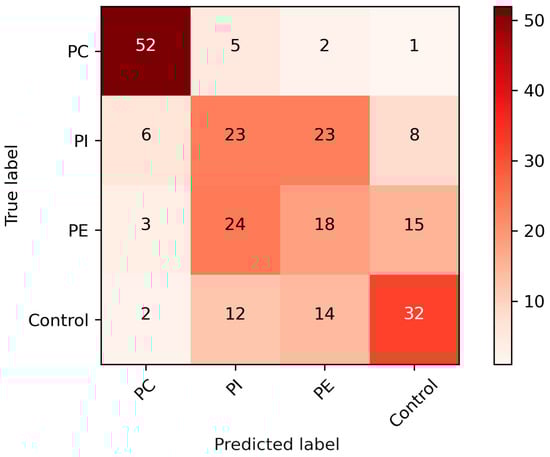 Four-class classification of all of the phospholipid classes, including the control class, using SVM. PC = phosphatidylcholine, PI = phosphatidylinositol, PE = phosphatidylethanolamine.