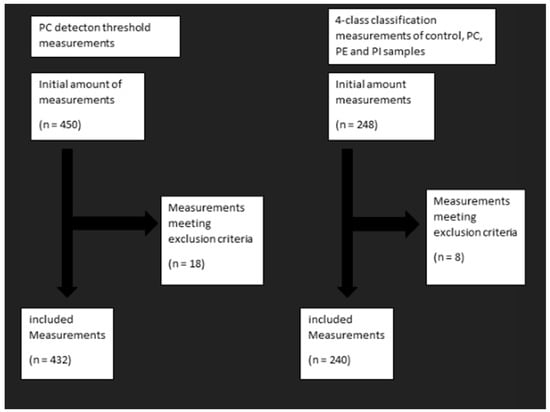 A monopolar surgical blade was used to produce surgical smoke from the samples. A randomized incision order was produced using a randomizer algorithm to prevent the bias of the previous measurement affecting the latter one. IN total, 30 incisions were made into each 1 g sample, combining to a total of 347 incisions for the PC detection threshold sets, 240 incisions for the four-class PL classification sets, and 180 incisions for the additional PE and PI detection threshold sets. Each incision lasted approximately 1 s. Measurements were excluded if they produced faulty dispersion plots, technical errors in the measurement system, or if the incisions produced extensive charring. The sampling deviation was visually monitored during measurements based on the live feedback of the sampling device. Significantly differing measurements were then excluded and repeated. The deviation was then additionally inspected during data analysis based on the signal intensity (pico ampers, pA) at the base of the DMS spectra. As a reference, the mean and standard deviation of the signal intensity were 180 pA and 26 pA in the PC detection threshold series and 222 pA and 31 pA in the multiple PL class detection series. An “empty” measurement of room air produces a signal intensity of 50 pA.