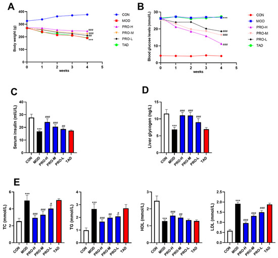 Effects of PROs on body weight, glucose, and lipid metabolism in DMED rats. (A) Changes in body weight of rats after treatment. (B) Changes in blood glucose levels of rats after treatment. (C) Serum insulin levels of rats in each group. (D) Liver glycogen levels of rats in each group. (E) Blood lipid (TC, TG, HDL, LDL) levels of rats in each group. Sixty rats were randomly allocated into six groups: the control group (CON), model group (MOD), PROs high-dose group (PRO-H), PROs medium-dose group (PRO-M), PROs low-dose group (PRO-L), and tadalafil (TAD) group. The data are expressed as the means ± SDs (n = 10). *** p < 0.001 vs. the CON group; ### p < 0.001, ## p < 0.01, # p < 0.05 vs. the MOD group. TC, total cholesterol; TG, triglyceride; HDL, high-density lipoprotein; LDL, low-density lipoprotein.