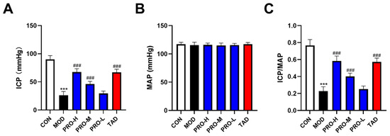 The ratio of maximum intracavernosal pressure (ICP)/mean arterial pressure (MAP) is a reliable indicator for the assessment of erectile function [32]. Our results showed that the ICP and ICP/MAP ratios in rats of the DMED group were significantly lower than those observed in the control group (Figure 2A,C). Both ICP and ICP/MAP ratios exhibited significant improvements in rats subjected to PROs and TAD treatment compared to their untreated counterparts (Figure 2A,C).