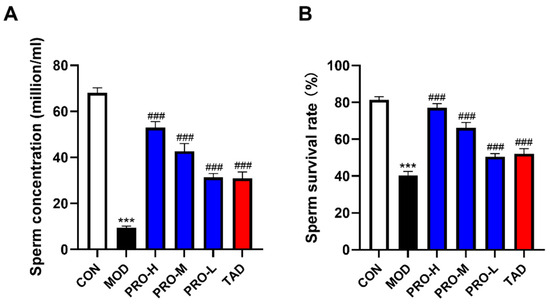 Effects of PROs on sperm quality in DMED rats. The epididymis of rats was collected, and subsequent analyses were conducted to determine sperm concentration and survival rates. (A) Sperm concentration of rats in each group. (B) Sperm survival rates of rats in each group (n = 10). The data are expressed as the means ± SDs. *** p < 0.001 vs. the CON group; ### p < 0.001 vs. the MOD group.