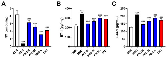 Effects of PROs on endothelial function in DMED rats. (A) NO levels of rats in each group. (B) ET-1 levels of rats in each group. (C) LOX-1 levels of rats in each group. The data are expressed as the means ± SDs (n = 10). *** p < 0.001 vs. the CON group; ### p < 0.001 vs. the MOD group. ET-1, of rats in each group; LOX-1, lectin-like oxidized low-density lipoprotein receptor-1.
