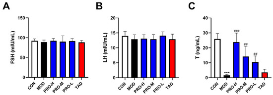 Endothelial function in males is modulated by sex hormones [35]. As illustrated in Figure 5, levels of testosterone (T) in the model group were significantly lower than those in the control group. T levels in the PROs group were markedly elevated compared to the model group. Nevertheless, the analysis revealed no statistically significant differences in the levels of luteinizing hormone (LH) and follicle-stimulating hormone (FSH) between the groups.
