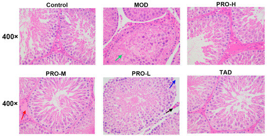 Hematoxylin and eosin (HE) staining of rat testis. Rats in the control group exhibited an intact testicular cell structure, tightly organized spermatogonia, and the presence of spermatozoa within the lumen without any apparent pathological alterations. Rats in the model group displayed dislodged spermatogonia, necrosis of spermatocytes, and a significant reduction in the number of spermatozoa, and distinct pathological changes. Conversely, the testicular tissues of the PROs and TAD treatment groups tended normalization. The green arrow indicates spermatocyte necrosis and nuclei consolidated or fragmented. The red arrow indicates eosinophilic tissue fluid exudation. The blue arrow signifies a sparsely arranged varicocele with widened gaps. The black arrow indicates interstitial capillary stasis.