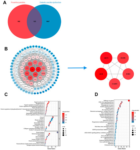 To identify potential targets for PROs in the treatment of DMED, we conducted a query for targets associated with PROs using the Pharmmapper database, as well as targets related to DMED derived from the GeneCards, OMIM, and TTD databases. In total, 162 potential drug targets and 1827 potential disease targets were identified from the databases above (Figure 7A). Subsequently, 123 common targets associated with PROs and DMED were identified through the application of a Venn diagram (Figure 7A), and a protein–protein interaction (PPI) network was constructed using the STRING database. Finally, Cytoscape software identified five key targets (AKT1, ALB, CASP3, ESR1, EGFR) of PROs that interact with DMED within the PPI network (Figure 7B).