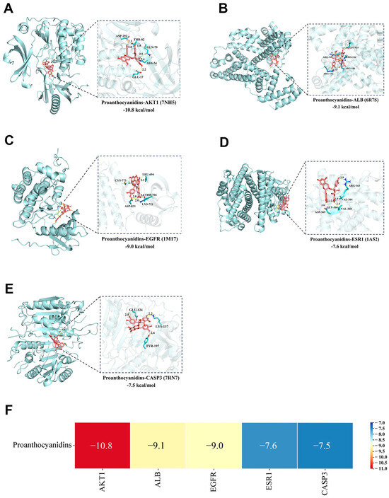 The five core targets (AKT1, ALB, CASP3, ESR1, and EGFR) were subjected to molecular docking with PROs. The results demonstrated that the binding energies were all less than −7.0 kcal/mol [36] (Figure 8A–F), indicating that PROs exhibit strong binding activity with AKT1, ALB, CASP3, ESR1, and EGFR.