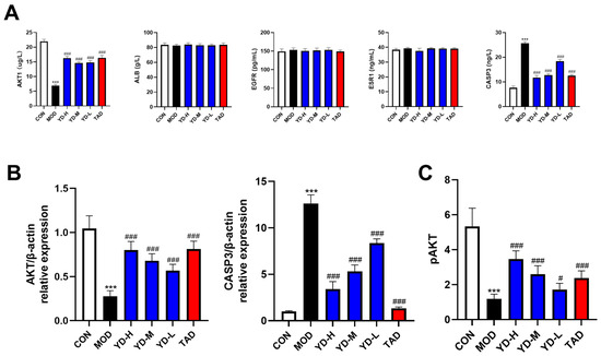 Effects of PROs on core target levels and the PI3K-Akt Pathway in DMED rats. (A) Evaluation of AKT1, ALB, CASP3, ESR1, and EGFR expression in the penile corpus cavernosum of rats (n = 10). (B) Relative mRNA expression levels of AKT and CASP3 (n = 5). (C) pAKT levels in the penile corpus cavernosum of rats (n = 10). The data are expressed as the means ± SDs. *** p < 0.001 vs. the CON group; ### p < 0.001, # p < 0.05, vs. the MOD group.