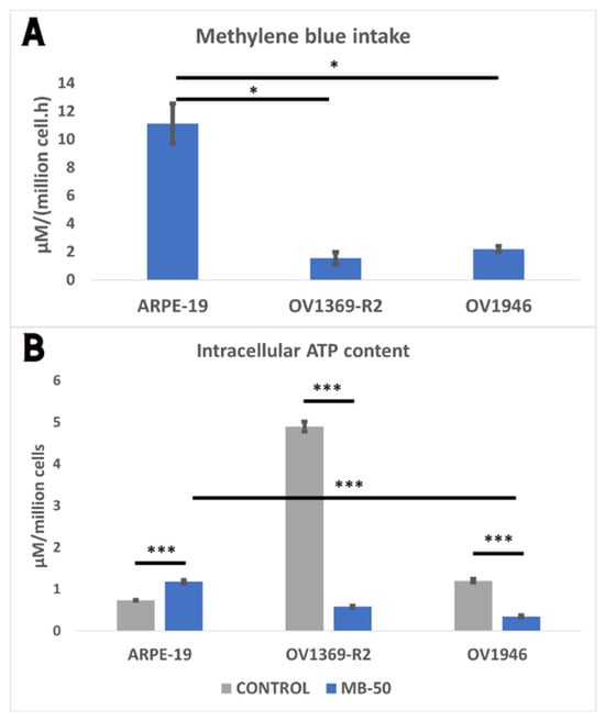 (A) Differential intake of methylene blue (MB) by ARPE-19, OV1369-R2, and OV1946 cell lines. ARPE-19 exhibited higher MB intake compared to the cancerous lines, with approximately 5-fold and 7-fold greater accumulation than OV1369-R2 and OV1946, respectively. (B) Modulation of free ATP levels in response to MB treatment. ARPE-19 cells showed an increase in ATP content upon MB treatment, while both OV1369-R2 and OV1946 displayed an MB-inhibitory effect on ATP levels. The adjusted p-value ≤ 0.05 were considered significant and the notations of * (p ≤ 0.05), and *** (p ≤ 0.001) were used.