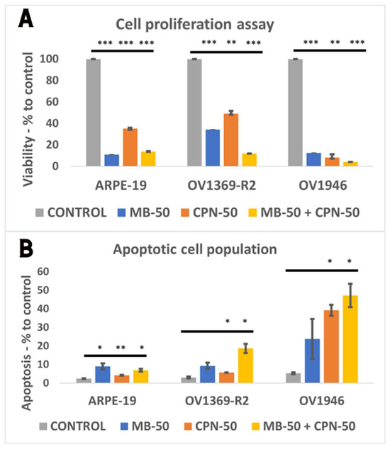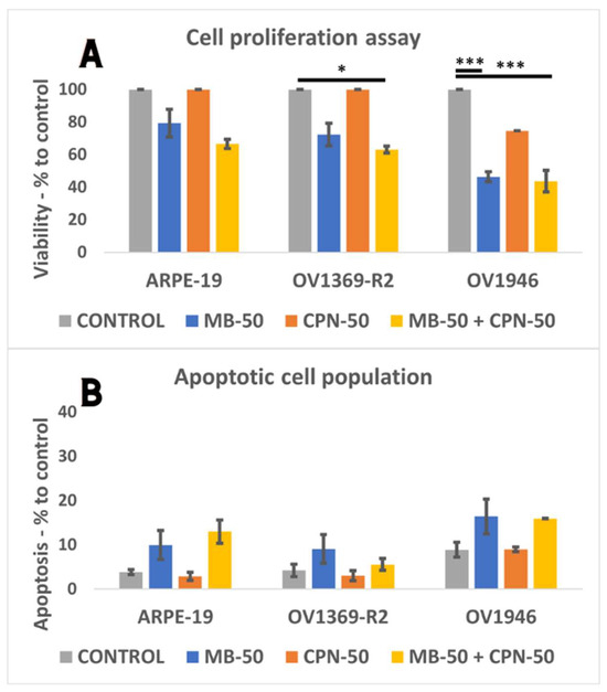 The impact of different treatment conditions on proliferation and apoptosis induction was assessed in the normal cell line ARPE-19 and the cancerous cell lines OV1369-R2 and OV1946 following overnight culture and subsequent 24 h incubation. Conditions included vehicle control (OSE culture medium), MB-50, CPN-50, and the combination of MB-50 and CPN-50 (IC50s provided in Figure S1). Flow cytometry by fluorescence-activated cell sorting (FACS) analysis was performed to evaluate treatment effects on cell proliferation and apoptosis. As shown in Figure 2A, neither ARPE-19 nor OV1369-R2 exhibited significant sensitivity to CPN-50 and MB-50, confirming OV1369-R2′s known chemo-resistance and OV1946′s intermediate sensitivity. However, both cancer cell lines showed significant sensitivity to MB-50 when combined with CPN-50 (p ≤ 0.05 and p ≤ 0.001 for OV1369-R2 and OV1946, respectively). OV1946 demonstrated the highest sensitivity to MB-50 (p ≤ 0.001), resulting in only 46 ± 3% proliferation compared to 72 ± 7% for OV1369-R2 (p ≤ 0.01) and 79 ± 9% for ARPE-19 after 24 h of treatment. The combination of MB-50 and CPN-50 did not significantly increase MB-50′s effect on cancer cell proliferation. Regarding apoptosis induction, MB-50 exhibited a modest effect on all three lines that was not significantly different from the control conditions (Figure 2B). However, OV1946 displayed slightly higher, but not significant apoptosis levels, particularly under MB-50 conditions, whether combined with CPN-50 or not. The adjusted p-value ≤ 0.05 were considered significant and the notations of * (p ≤ 0.05), ** (p ≤ 0.01), and *** (p ≤ 0.001) were used.